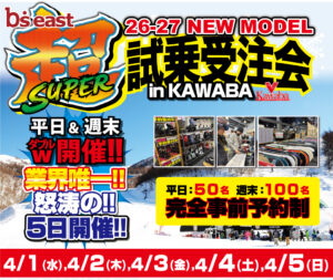26-27 NewModel Snowboardニューモデル スノーボード 試乗会 ☞ 業界唯一の超試乗&受注会!! ☞ 参加ブランドは全30ブランド以上!! ☞ 他店圧倒の試乗会限定特典!! … 続きを読む 26-27ビーズイースト超試乗会申し込み